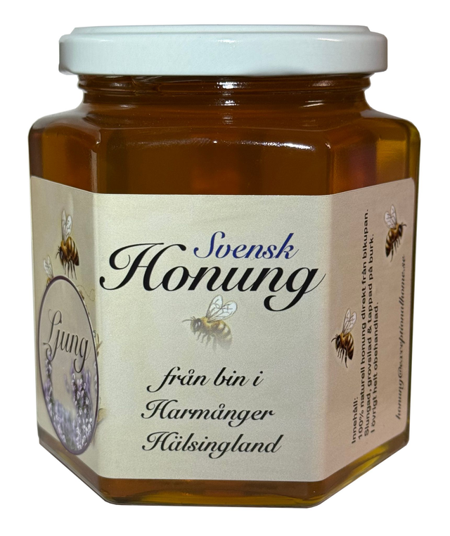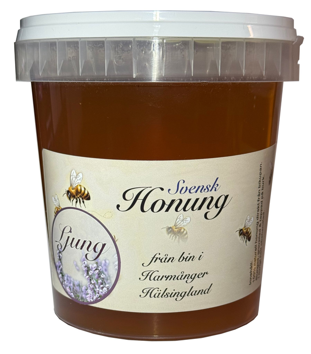 Ljuvlig nyslungad ljunghonung från årets sista slugning. Ljunghonung är en delikatess och kostar lite mer. Lite kraftigare i smaken än de flesta andra honungar, med en lite sträv efterton. Ljungen ger även honungen en härligt blommig doft.